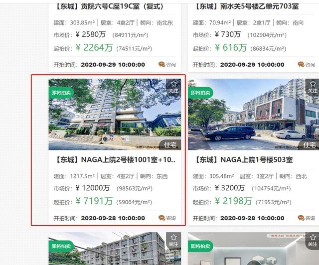 这2套将于9月28日开始拍卖的豪宅,位于北京二环路内东直门大街NAGA上院2号楼1001室、1002室。瀚海法拍网显示,“NAGA上院99席专为鼎级人士打造的高档住宅,开发商抱着‘为一群好朋友,找一群好邻居’的理念盖房,最小面积300平方米,最大面积600平方米。”