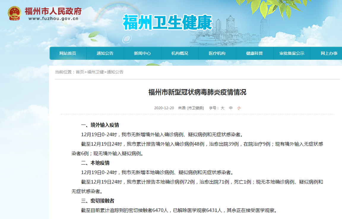 截至12月19日24时,福州累计报告本地确诊病例72例,治愈出院71例,死亡1例;现无本地确诊病例、疑似病例和无症状感染者。