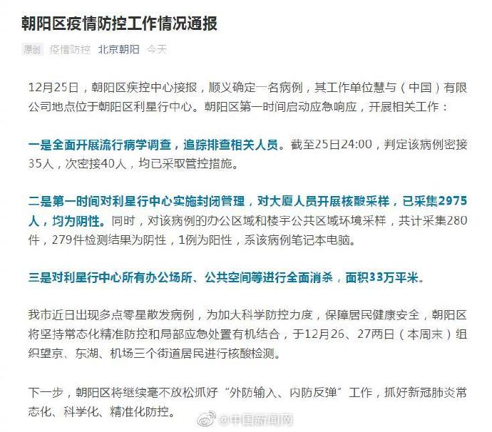据“北京朝阳”通报,12月25日,朝阳区疾控中心接报,顺义确定一名病例,其工作单位慧与(中国)有限公司地点位于朝阳区利星行中心。朝阳区第一时间对北京朝阳利星行中心实施封闭管理,对大厦人员开展核酸采样,已采集2975人,均为阴性。同时,对该病例的办公区域和楼宇公共区域环境采样,共计采集280件,279件检测结果为阴性,1例为阳性,系该病例笔记本电脑。(中国新闻网)