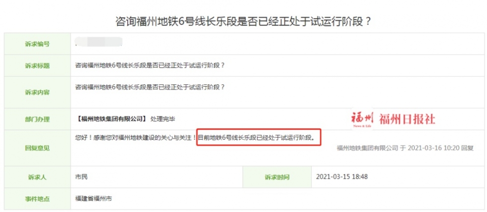 据福州市12345便民(惠企)服务平台消息,福州地铁集团在回复一位网友诉求时表示,地铁6号线长乐段已经处于试运行阶段。