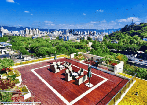 它地处福州市中心乌山旁、白马河畔,拥有顶楼空中花园食堂。