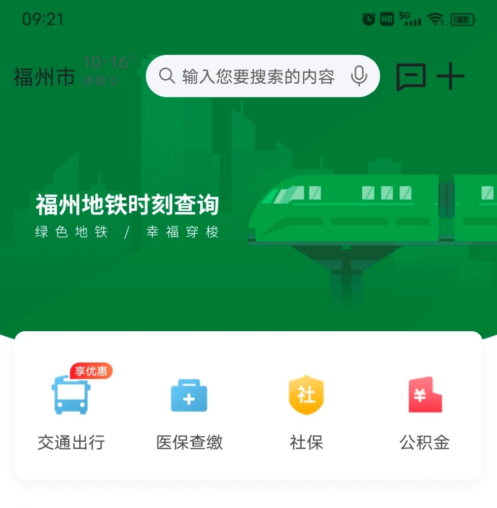 在“e福州”首页点击“交通出行”在乘车二维码下方找到“地铁时刻查询”。