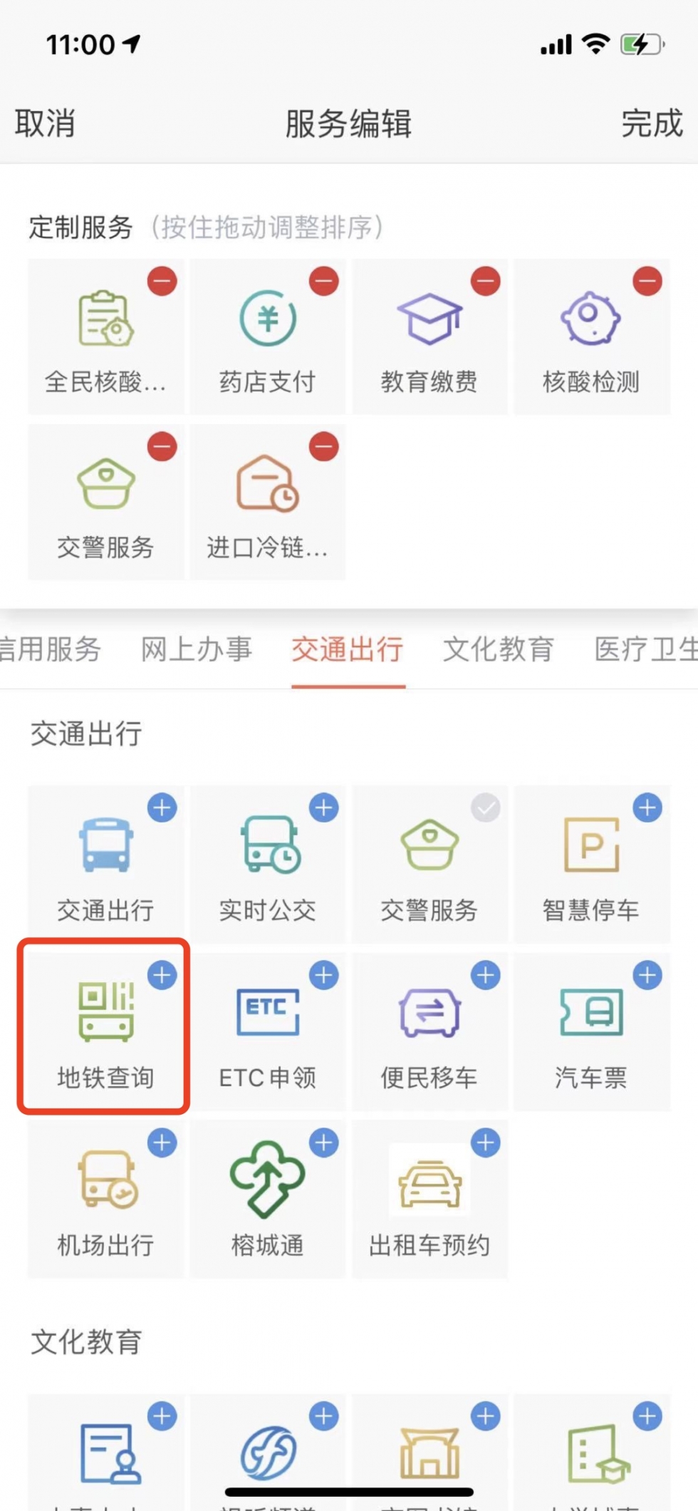 在“e福州”首页点击“全部”后,选择“交通出行”服务专题,找到“地铁查询”。