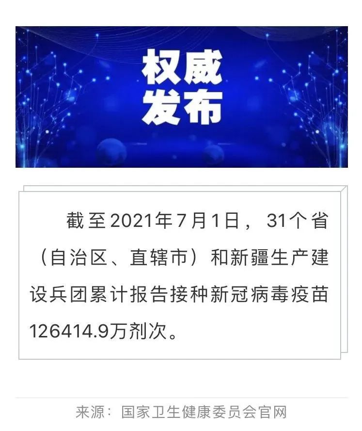 截至2021年7月1日,全国接种新冠病毒疫苗已达126414.9万剂次。