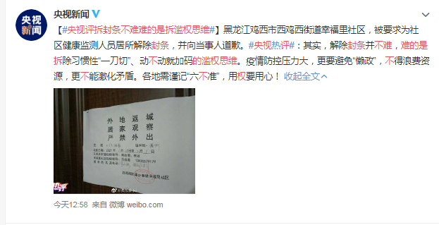 黑龙江鸡西市西鸡西街道幸福里社区,被要求为社区健康监测人员居所解除封条,并向当事人道歉。央视热评:其实,解除封条并不难,难的是拆除习惯性“一刀切”、动不动就加码的滥权思维。疫情防控压力大,更要避免“懒政”,不得浪费资源,更不能激化矛盾。各地需谨记“六不准”,用权要用心!