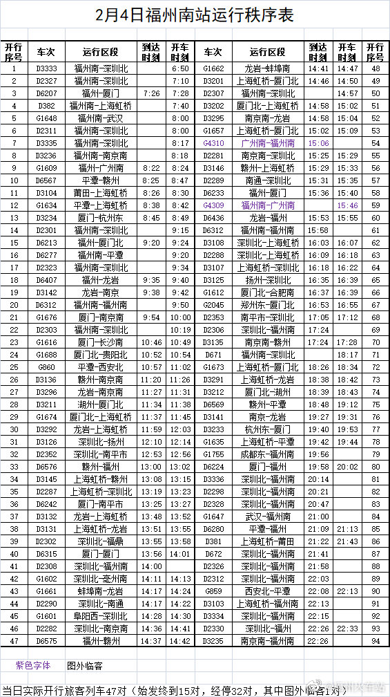2月4日,福州南站当日实际开行旅客列车47对(始发终到15对,经停32对,其中图外临客1对)。