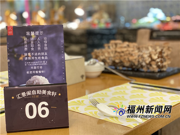 作为2020年度福州首家“文明餐厅”入选者,在闽江世纪金源会展中心大饭店汇景阁自助美食轩,记者看到,餐厅醒目位置和餐桌上均设立了告示牌及提示卡,提升顾客和员工的文明意识。餐厅服务员来回穿梭巡查,引导客人使用公筷公勺,同时提醒客人“按需点菜”,对于剩菜,也主动为顾客提供免费打包餐盒。
