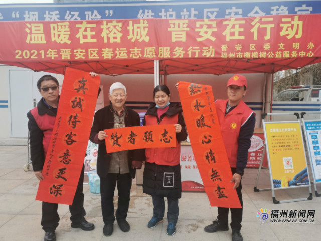 采访中,林向荣自豪地向记者展示了一张图片——一位老人与三位志愿者合影,大家手上捧着春联。林向荣说,1月27日上午11时许,一位满头白发的老先生拖着行李箱从动车站缓慢走出,志愿者连忙上前接过行李,请老先生在“红帐篷”内休息片刻,并端上一杯茶水。老先生很是感动,弯腰打开行李包,找出笔墨纸砚,现场挥毫题写一幅春联赠予志愿者。