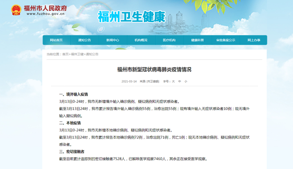 截至3月13日24时,我市累计报告本地确诊病例72例,治愈出院71例,死亡1例;现无本地确诊病例、疑似病例和无症状感染者。