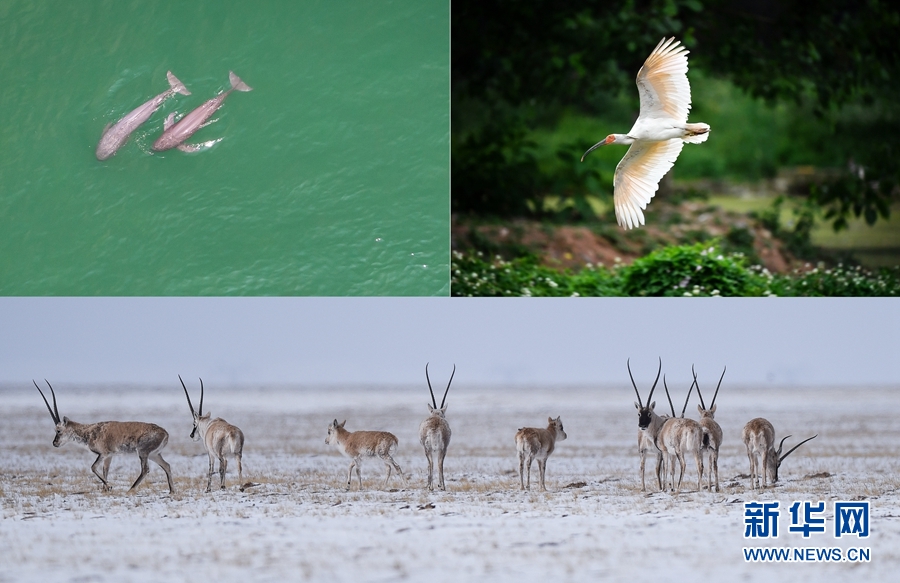 这是一张拼版照片:左上图为在湖北省宜昌市江边,长江江豚在水中嬉戏(无人机照片,新华社记者肖艺九5月11日摄);右上图为陕西省汉中市洋县朱鹮生态园内的朱鹮(新华社记者刘潇5月13日摄);下图为藏羚羊在三江源可可西里地区活动(新华社记者吴刚4月20日摄)。新华社发