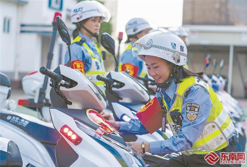 6日,霞浦县公安局骑警中队的20多名男女骑警,在给警用摩托车贴上“爱心护考车”字样,为第二天开考的高考考生提供服务。郑培銮 摄
