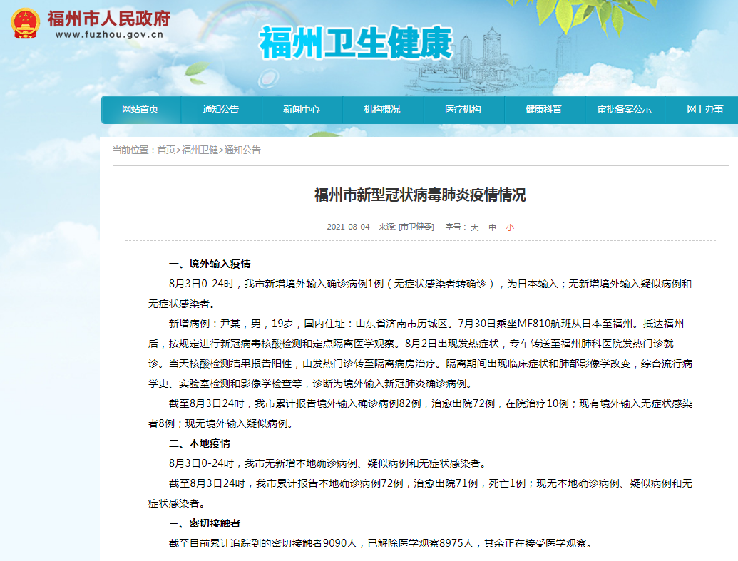 截至8月3日24时,福州累计报告本地确诊病例72例,治愈出院71例,死亡1例;现无本地确诊病例、疑似病例和无症状感染者。