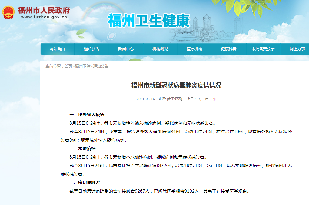截至8月15日24时,福州累计报告本地确诊病例72例,治愈出院71例,死亡1例;现无本地确诊病例、疑似病例和无症状感染者。