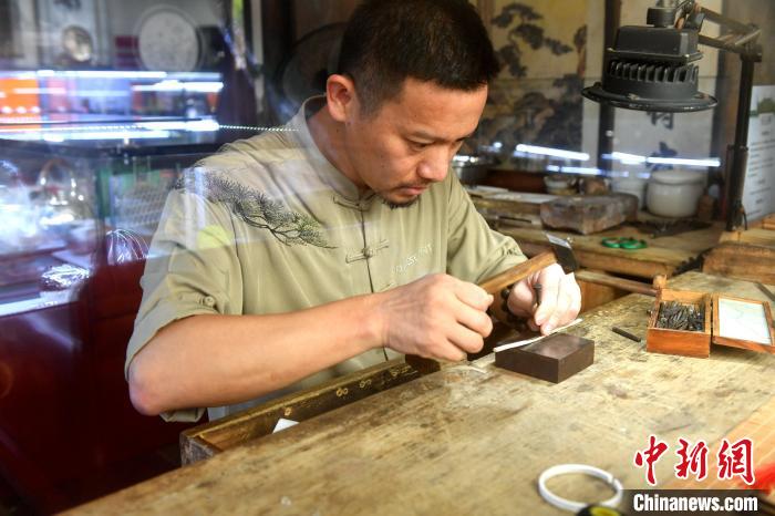 中新网福州8月19日电 (叶秋云)“邦、邦、邦……”18日,一阵敲打声从福州市三坊七巷珍华堂银楼传出,福建省工艺美术大师林伟星正埋头制作银手镯,小铁锤捶打着垫在银条上的錾刀,錾刻时发出的响声吸引了游客驻足观看。