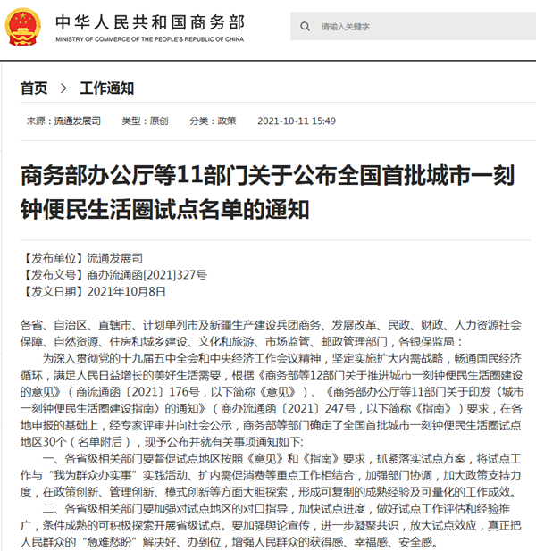 10月11日,国家商务部公布了全国首批城市一刻钟便民生活圈试点名单,确定了全国30个试点城市,福建省福州市、厦门市位列其中。