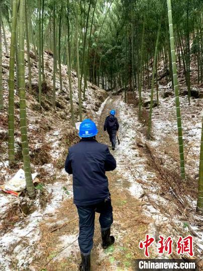 国网宁化县供电公司工作人员深入银装素裹的山林中开展特巡保电工作。邱静 摄