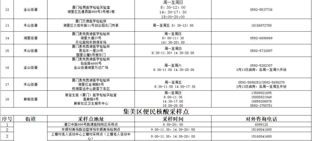 为方便广大市民核酸检测,自3月13日19时至3月31日24时,厦门市设置157个便民核酸采样点,免费为市民群众进行核酸检测。3月13日所有采样点服务时间延长至24时,其中16家检测机构提供24小时检测服务。