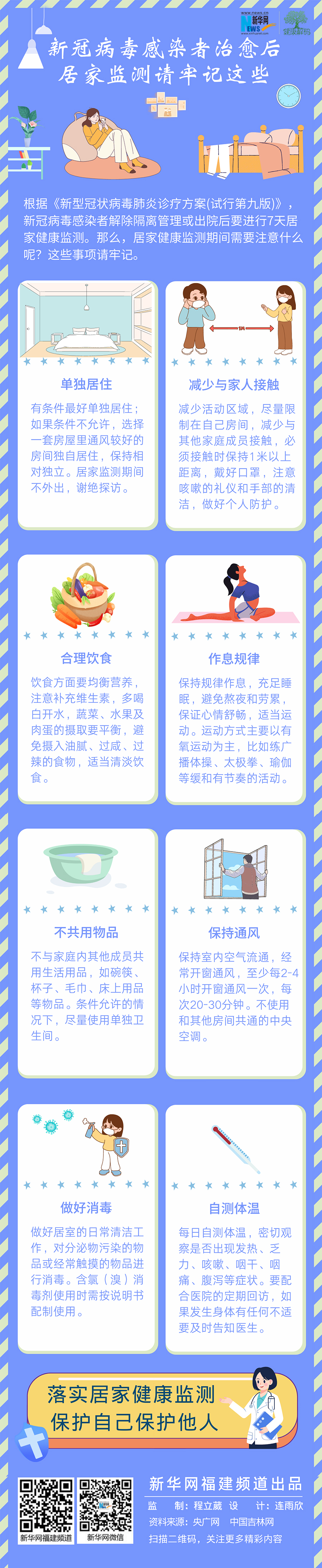 根据《新型冠状病毒肺炎诊疗方案(试行第九版)》,新冠病毒感染者解除隔离管理或出院后要进行7天居家健康监测。那么,居家健康监测期间需要注意什么呢?这些事项请牢记。(连雨欣)