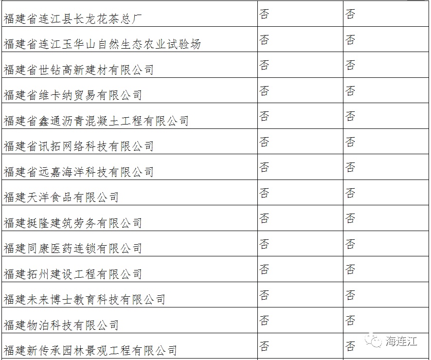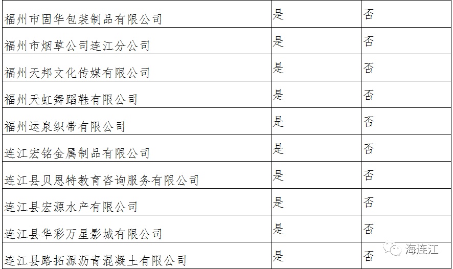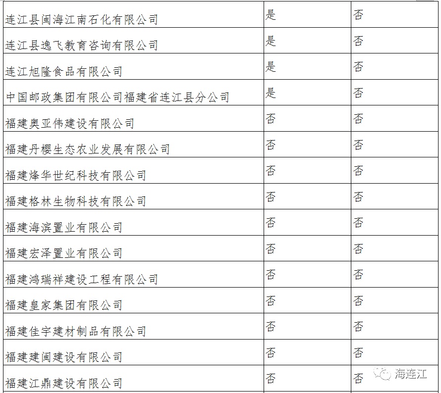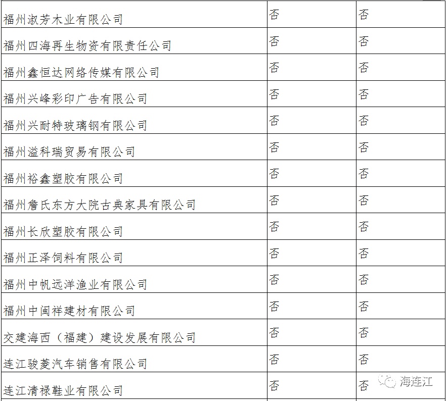 此类困难企业名单由福州市人社局参照税务、商务、统计等部门提供的数据筛选确定公示并已导入培训管理平台,连江县有236家企业凭第一类身份申领,目前已有91家企业在平台注册账号,其中已提交补贴申请的企业有48家,未提交补贴申请的企业有43家,另外还有145家企业未注册申请账号,具体名单如下: