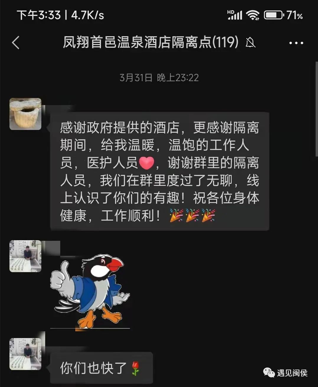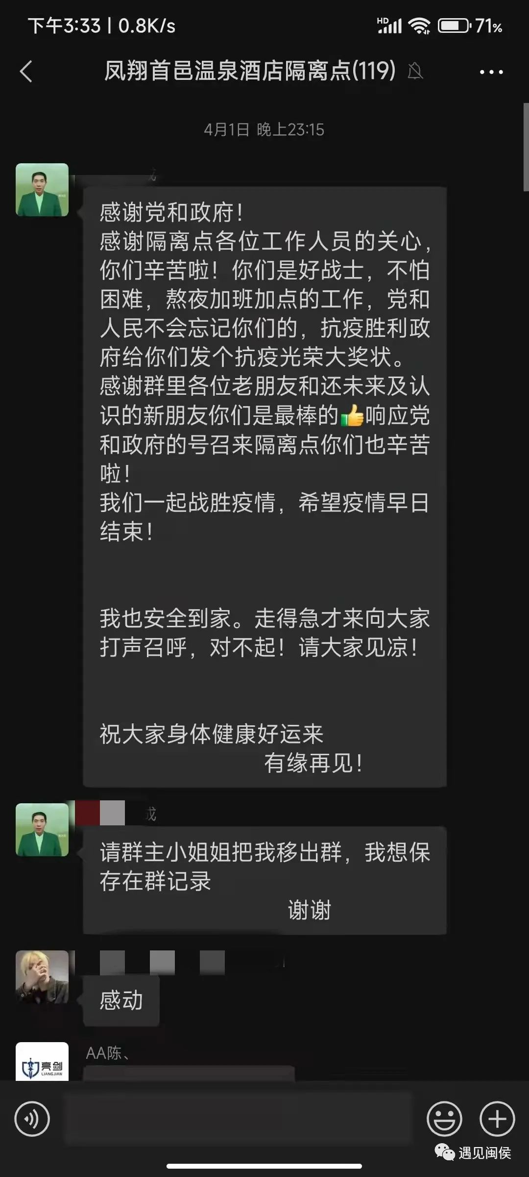 “感谢酒店工作人员和医护人员在这段时间的照顾,辛苦大家啦!”“工作人员着实辛苦和不易,致敬!”……连日来,闽侯凤翔首邑定点隔离酒店的微信工作群里,收到了不少暖心话语,朴实的语言里流露着浓浓真情与深深感激,让隔离点工作人员倍感温暖。