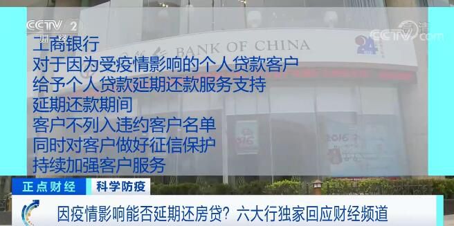 中国银行专门出台了包括延长贷款期限、延迟还本付息、设置还款优惠期在内的一揽子个人住房贷款保障政策。中国银行上海分行表示,如果客户因疫情产生逾期,可向银行发起征信异议更正相应逾期记录。中国银行吉林分行为吉林省客户设置10天还款宽限期,在宽限期内还款不计罚息、不上征信;符合条件的客户,延迟还款期限最长3个月,如果疫情延长还将适当延长期限。