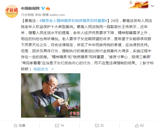 24日,最高法发布人民法院老年人权益保护十大典型案例。最高人民法院民一庭副庭长王伟表示,近年来,随着人民生活水平的提高,老年人经济供养要求下降,精神慰藉需求上升,相应的纠纷也有所增加。老人要求子女定期探望的诉求,是希望子女能够承欢膝下而享天伦之乐,符合法律规定,体现了中华民族传统的孝道,应当得到支持。但是,因涉及具体行为,强制执行的难度远比给付金钱案件大得多,实施过程中存在一定的困难。“精神赡养”和“物质赡养”同样重要,“谁言寸草心,报得三春晖”“常回家看看”应当是子女们发自内心的行为,而不应是法律强制的结果。(彭宁铃 郎朗)
