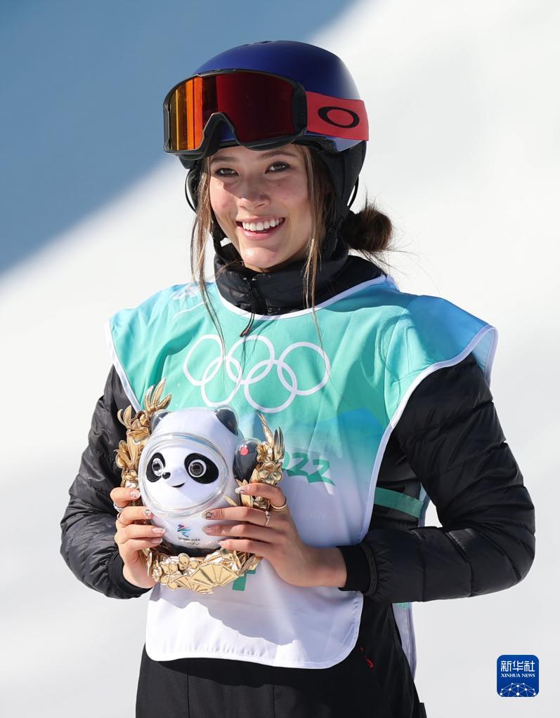 2月8日,自由式滑雪女子大跳台比赛冠军、中国选手谷爱凌在颁发纪念品仪式上。新华社记者 丁旭 摄