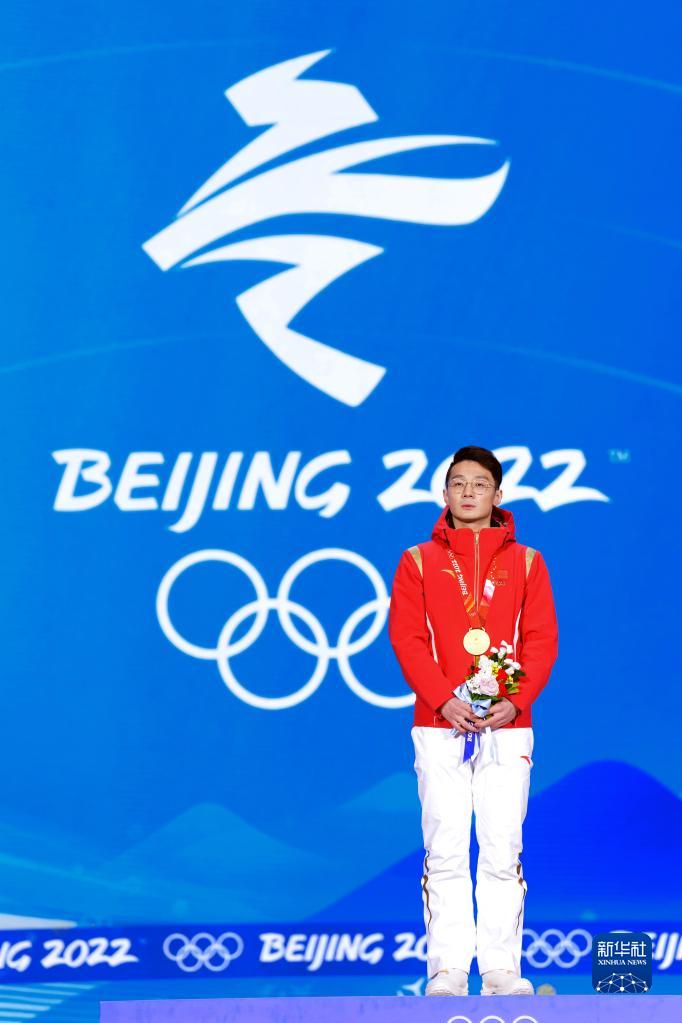 2月8日,短道速滑男子1000米比赛冠军、中国选手任子威在奖牌颁发仪式上。新华社记者 鞠焕宗 摄