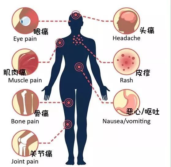 典型的登革热临床表现为突起发热,严重头痛,全身肌肉、骨骼和关节痛,极度疲乏;出现皮疹,淋巴结肿大及白细胞减少等。重症病例会出血、休克,病情进展非常快,不及时抢救会导致死亡。