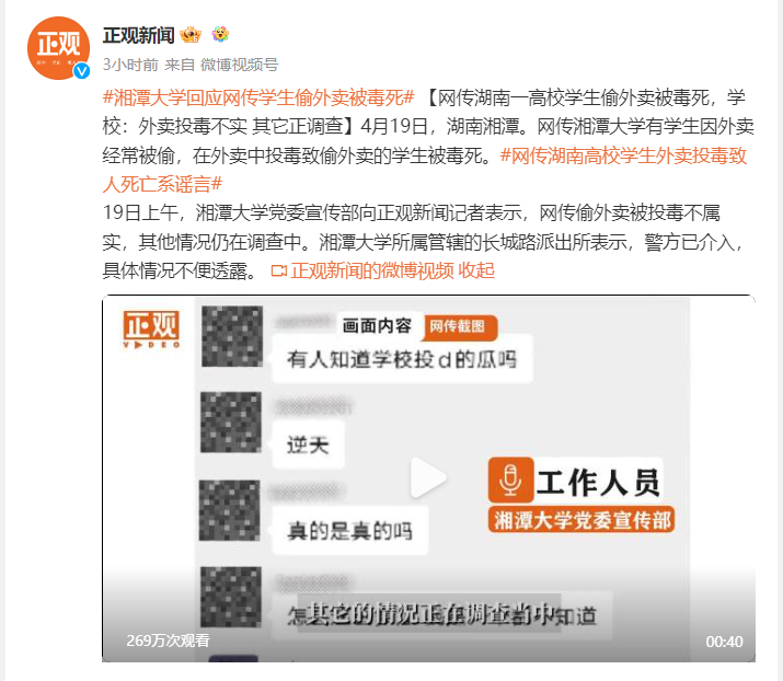 19日上午,湘潭大学党委宣传部向正观新闻记者表示,网传偷外卖被投毒不属实,其他情况仍在调查中。湘潭大学所属管辖的长城路派出所表示,警方已介入,具体情况不便透露。